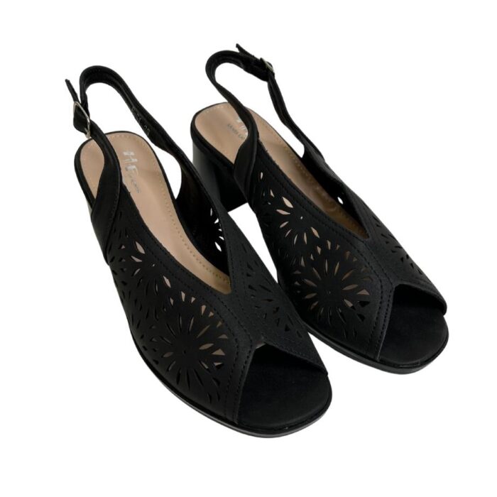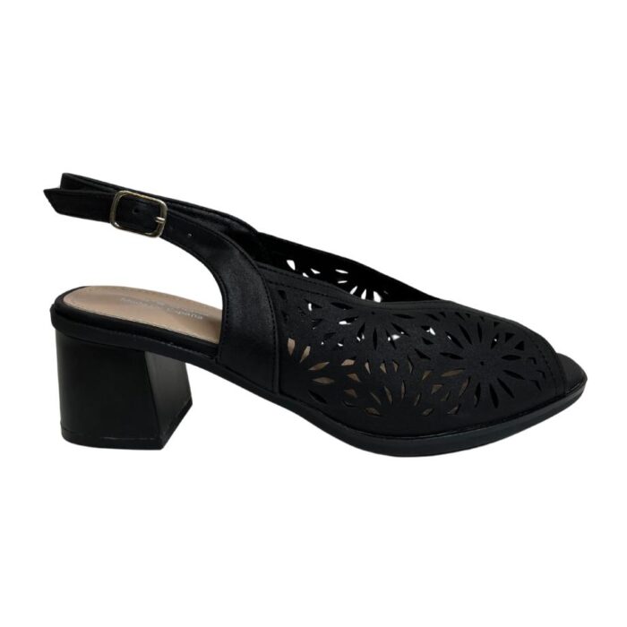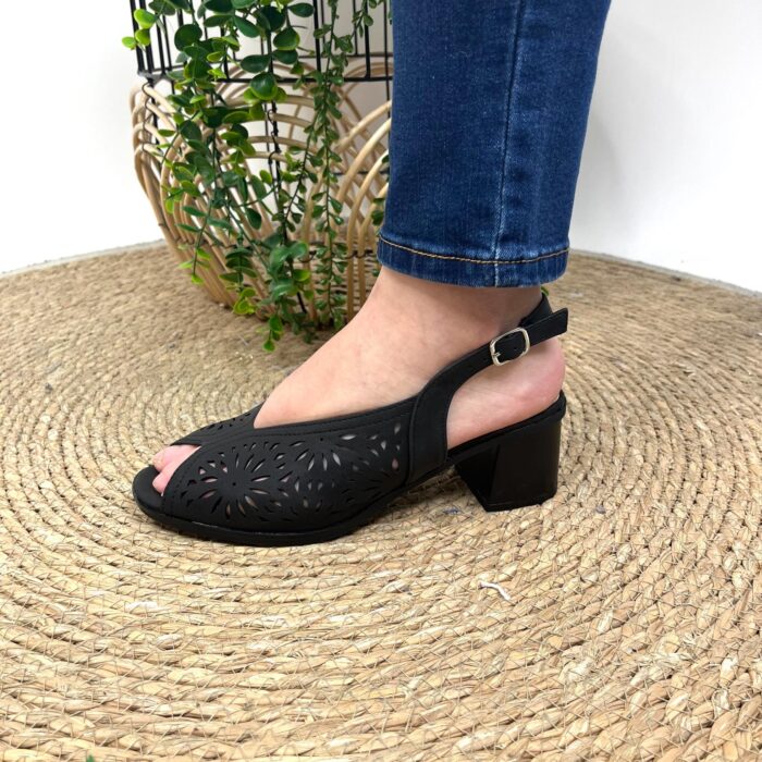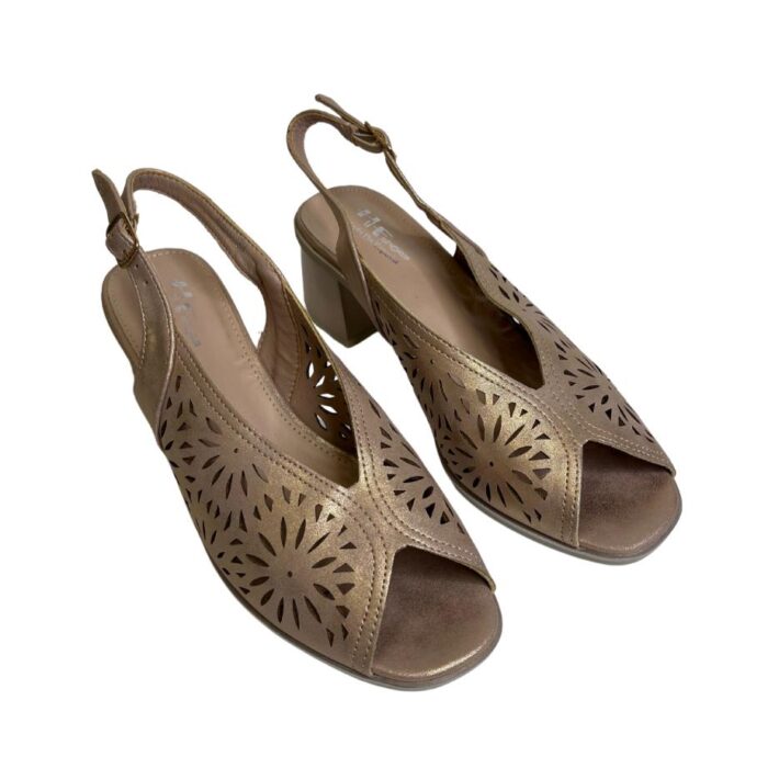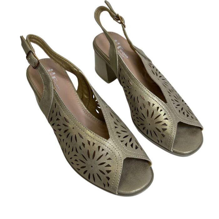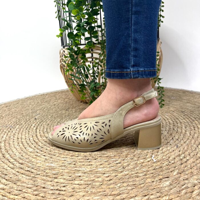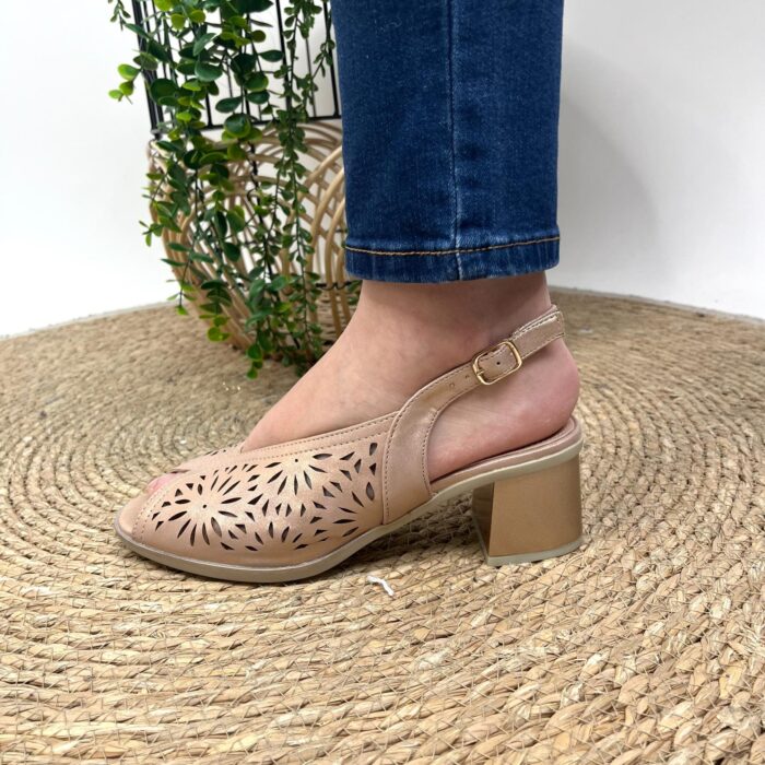 Zapato de vestir con puntera abierta y corte en mariposa. Pala calada muy blandita haciendo bonito dibujo y sujeción con hebilla trasera al talón en mismo tono. Altura talón 6cm. Altura tacón 6cm. Altura delantera 1cm.