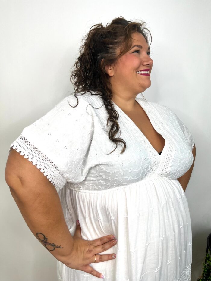 Las medidas de la modelo son; Pecho: 125cm | Cintura: 127cm | Cadera: 145cm | Brazo: 48cm