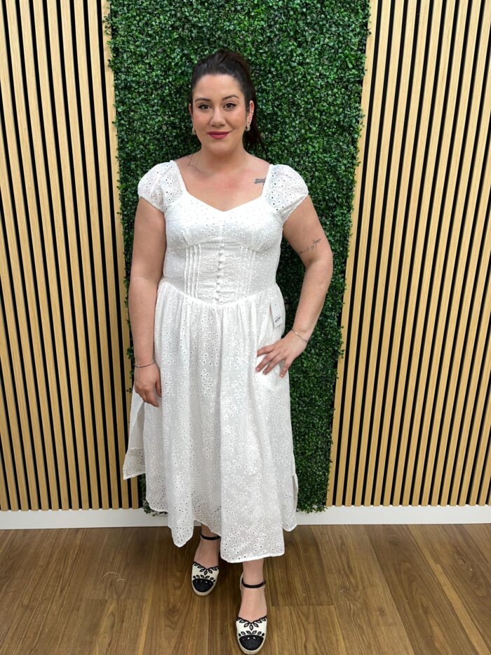 Las medidas de la modelo son; Pecho: 120cm | Cintura: 120cm | Cadera: 140cm | Brazo: 46cm | Lleva la M/L