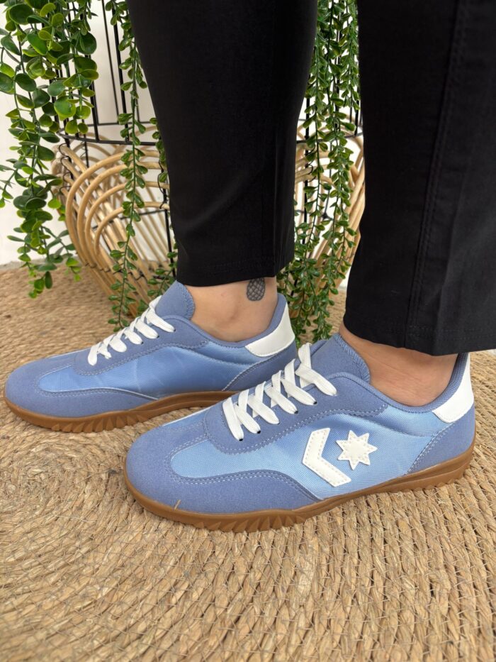 Zapatilla ligera en tono azul con combinaciones de nylon en laterales y antelina en puntera, zona cordones y trasera. Detalles en lateral y trasera en polipiel blanco. Ajustable con cordones y plantilla extraíble.